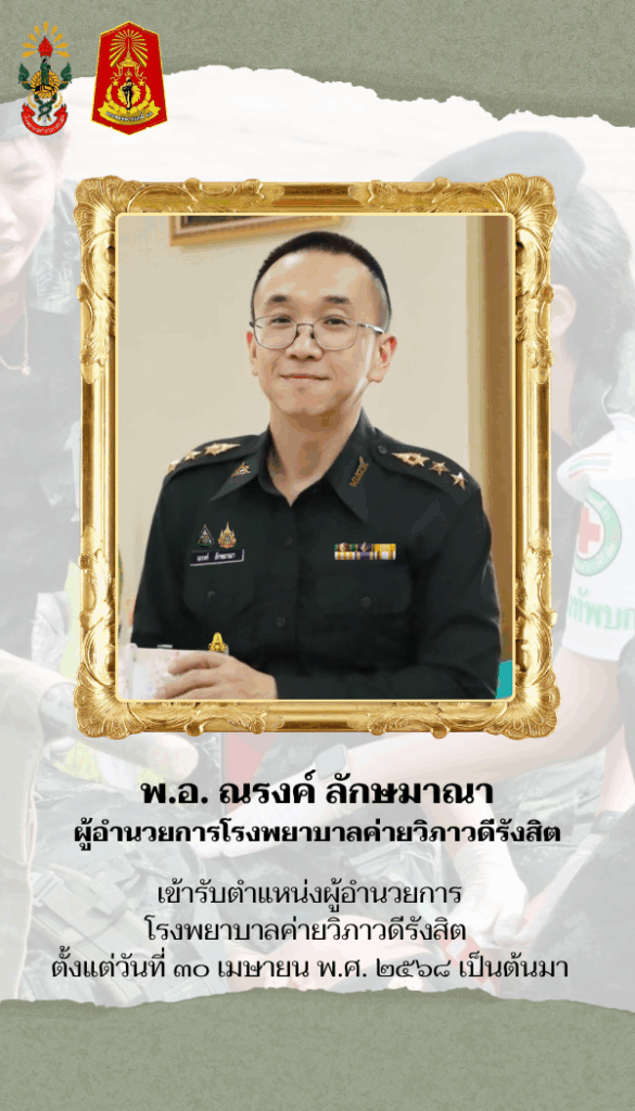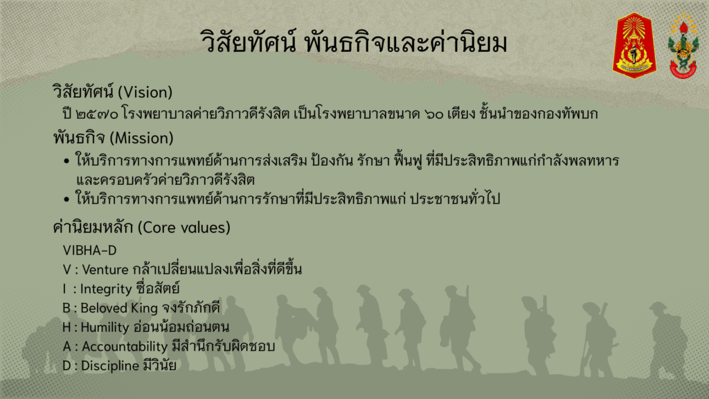 โรงพยาบาลค่ายวิภาวดีรังสิต มุ่งมั่นให้บริการทางการแพทย์ด้วยมาตรฐานและความเชี่ยวชาญ เราพร้อมดูแลสุขภาพของท่านกำลังพล ครอบครัว และประชาชนทั่วไป ด้วยบุคลากรผู้เปี่ยมประสบการณ์และเครื่องมือทางการแพทย์ที่ทันสมัย
