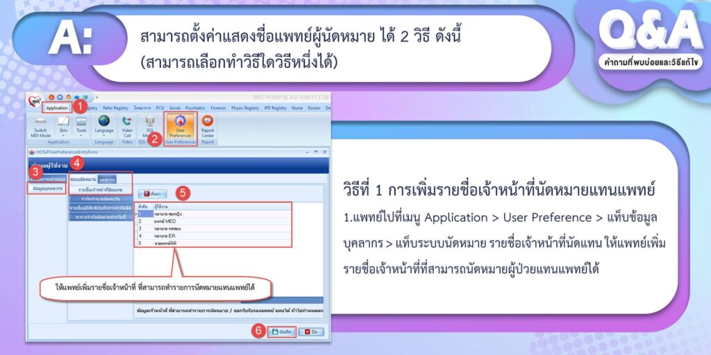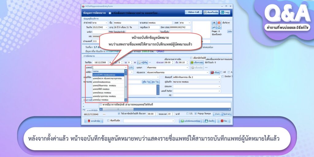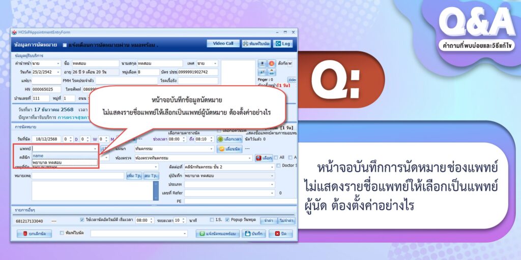 5. หน้าจอบันทึกการนัดหมาย ช่องแพทย์ ไม่แสดงรายชื่อแพทย์ให้เลือกเป็นแพทย์ผู้นัด ต้องตั้งค่าอย่างไร