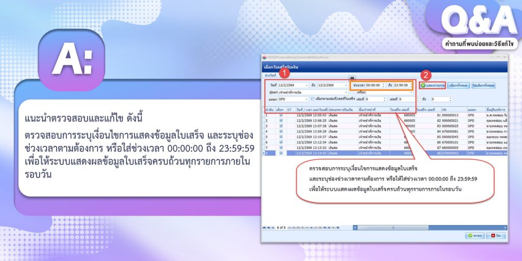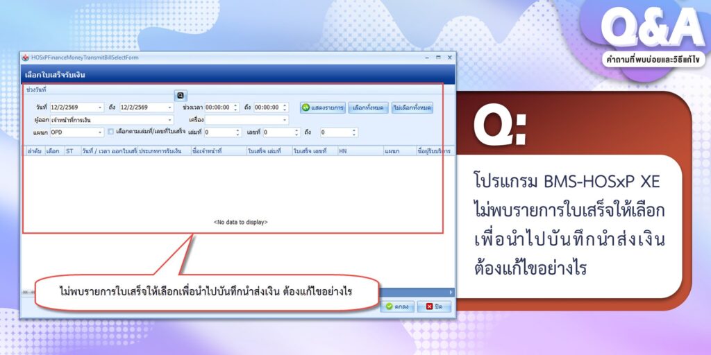 4. โปรแกรม BMS-HOSxP XE ไม่พบรายการใบเสร็จให้เลือกเพื่อนำไปบันทึกนำส่งเงิน ต้องแก้ไขอย่างไร